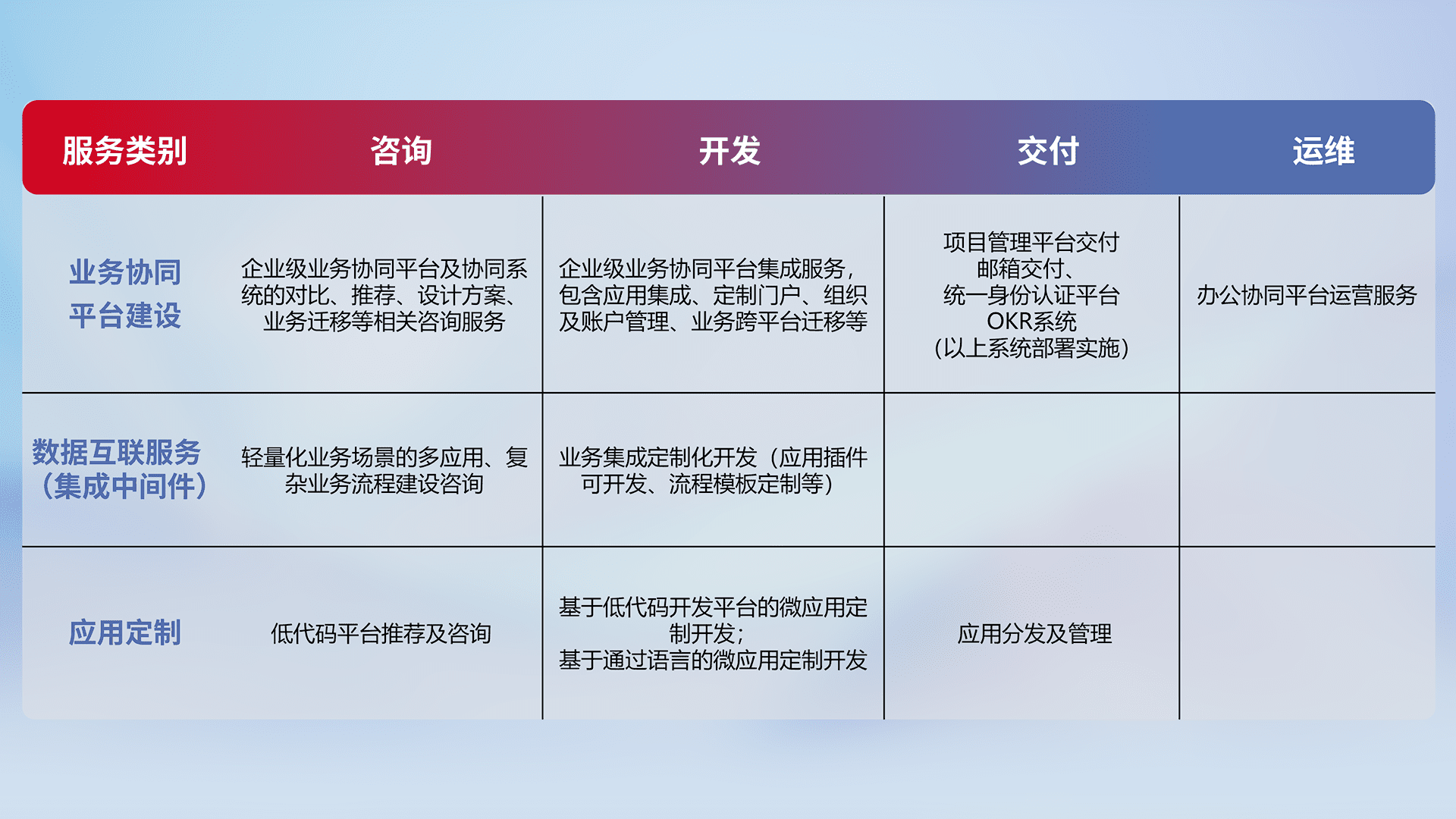 针对钉钉、、、、企微、、IDaas等平台级产品提供产品的规划、、、、方案、、、、交付、、定制化开发等服务,,,实现如统一协同办公、、智能客户服务、、、混合会议管理、、智能数据查询、、、、等业务场景,,实现数字化转型。。。